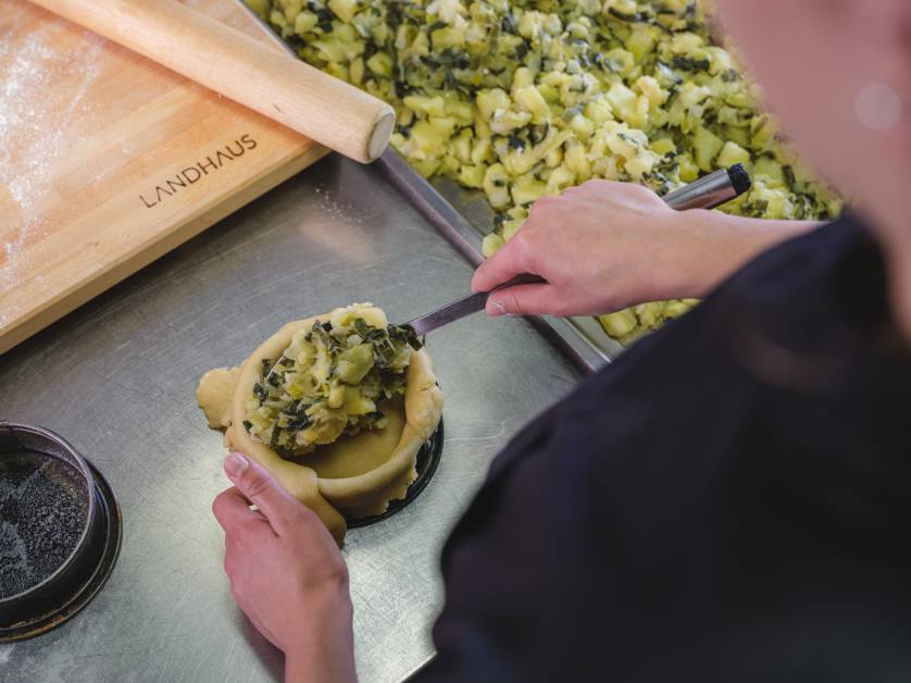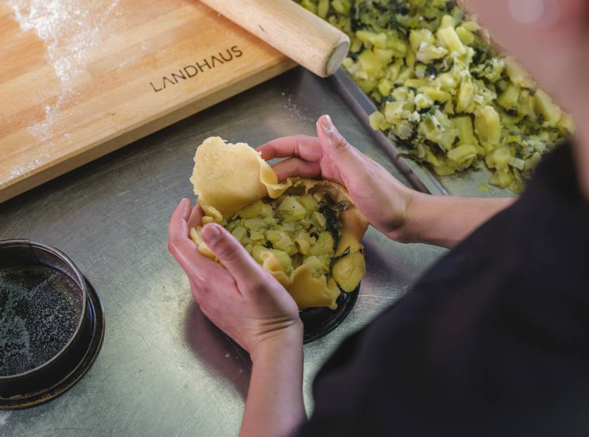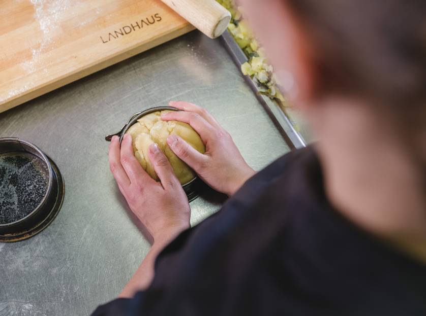 In the old days, the pan of cholera was put in the coals to bake. The German word for coal in the Valais is chola or cholu. In Valais, the term cholära also refers to the open antechamber in the bakehouse where the coals were collected in a pit in front of the oven door. However, there is no certainty about the origin of the word. What we do know is that our cholera is a must-eat in the LANDHAUS and therefore our favourite dish. Enjoy your meal! Would you also like to try this delicacy at home? We will be happy to give you our recipe when you check out.