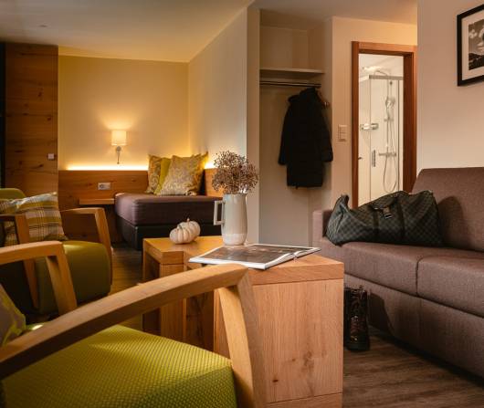 For you is good not good enough? Then, this is the right room for you. With two balconies, two flat screen TVs and a large bathroom with a rain shower, you will spend the night in the LANDHAUS with plenty of space. The feel-good lounge is perfect for having an aperitif with friends. It is also possible to book the triple room and thus receive a room for up to 5 people